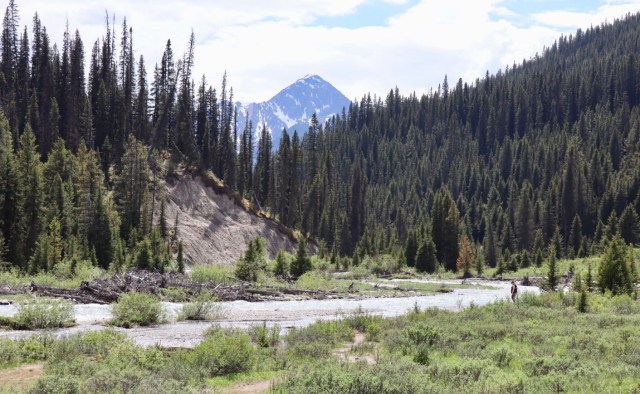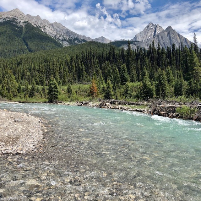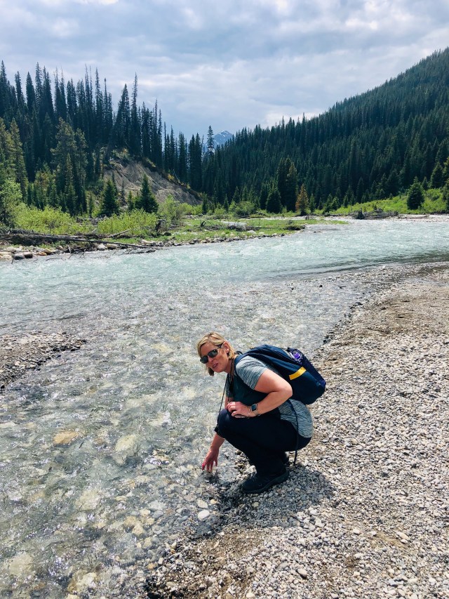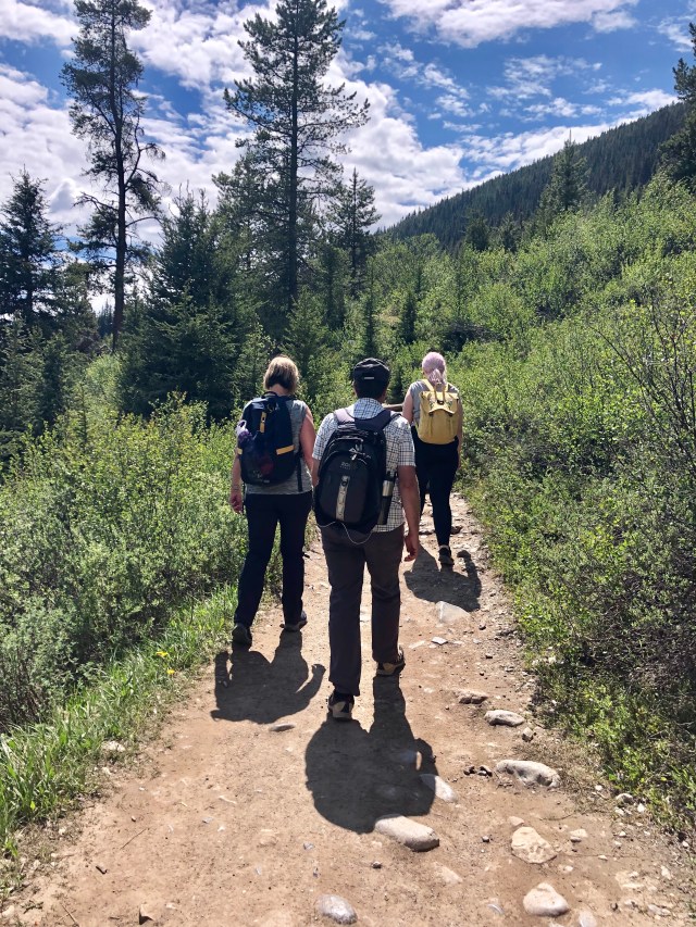 After hiking uphill through the forest, we then descended the slopes towards Johnston Creek Meadows with wonderful views of the beautiful landscape, the glacial river with a backdrop of lush pine forest and mountain peaks.