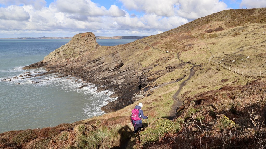 Before setting off we took time to enjoy the splendid view of the beach. From here the path rises and continues as a winding track across the grassy cliff side. After rounding Davy Williams Haven, up ahead is the distinctive headland rock, known as ‘Rickets Head’, where a group of walkers standing at the base provided a useful scale to its height.