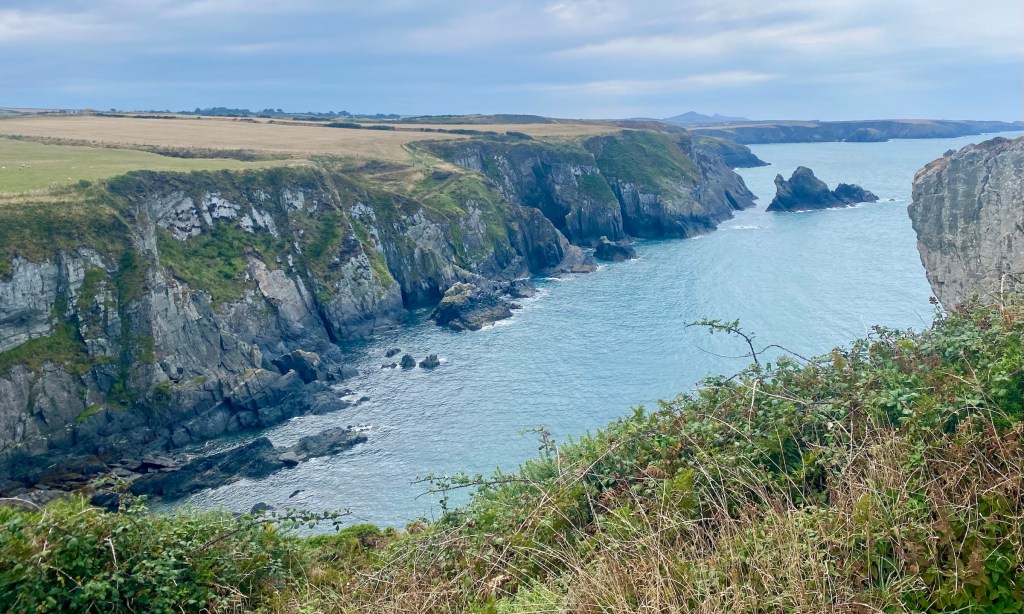 The path tracks across fields above the cliffs, which means views are mostly out across the sea, but the prominent rocky headland of Pen Castell Coch juts defiantly into the bay.